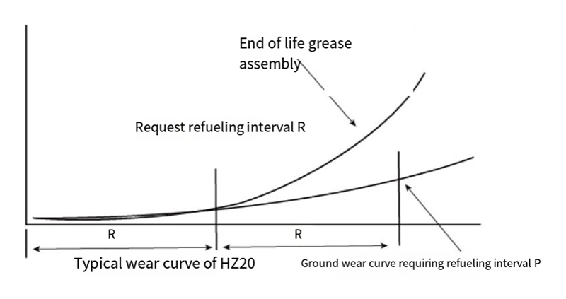 Ha a HZ20 perselyt zsírral, például lítium alapú vagy szilikonzsírral szerelik fel. Élettartama eltér az üzemállapotban mért PV értéktől. például. amikor a PV értéke körülbelül 2,5 MPam/s. élettartama körülbelül 200 óra; ha a PV érték 0,1Mpa-m/s, élettartama I0,0oohr felett is lehet (részletekért lásd a táblázatot) A HZ20 persely kenési karbantartásának R ciklusa az élettartamának körülbelül a fele. Például, ha PV=25Mpam/s. 100 óránként olajjal kell kenni.