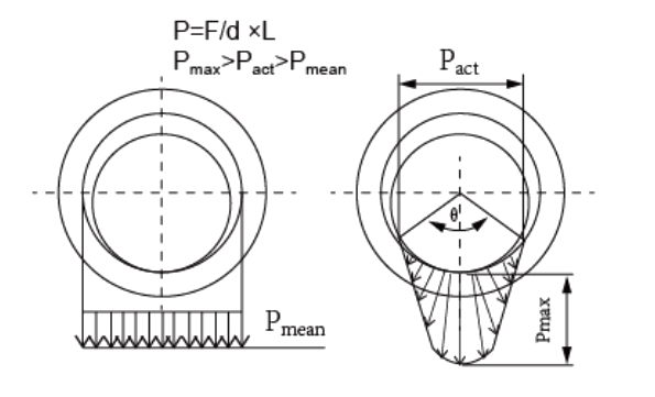 A hézag tényezőjeként a perselyek letörése, olajhorony stb. A tényleges terhelés (Pact) nagyobb, mint a számítási elmélet (Pmean).